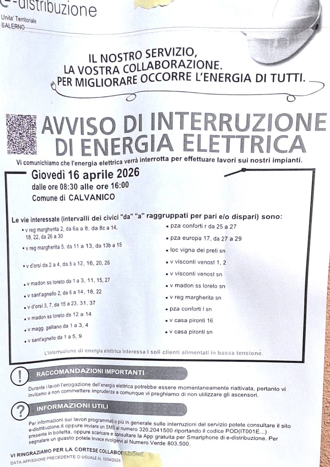 Si informa la cittadinanza che, a causa di interventi programmati da parte di Enel, sarà necessaria un'interruzione programmata dell'energia elettrica per consentire lavori di manutenzione sulla rete.